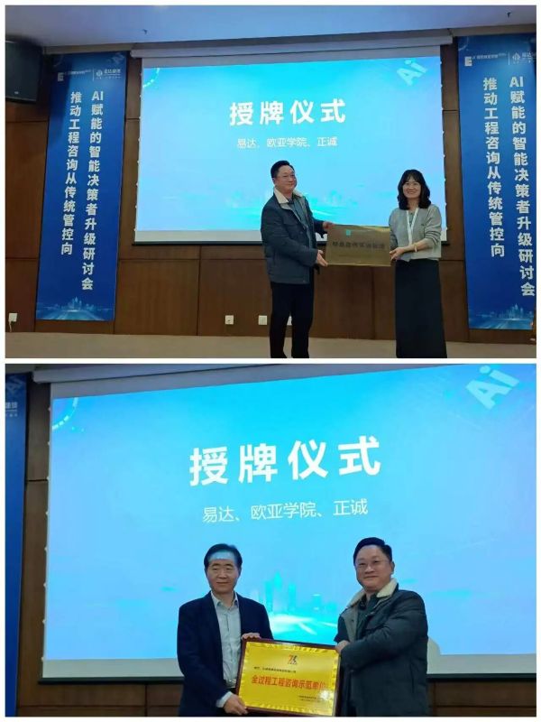 会上,在全体嘉宾的共同见证下,广州易达建信科技开发有限公司完成两项重要授牌:为西安欧亚学院授予“校企合作实训基地”,为正诚管理咨询集团有限公司授予“全过程工程咨询示范单位”。